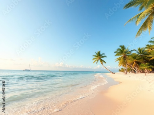 A peaceful and serene beach background with golden sand, clear blue water, and palm trees swaying in the gentle breeze, coastal, paradise