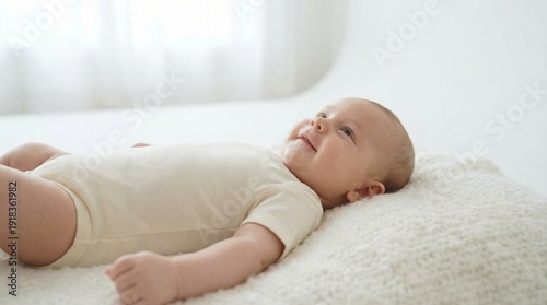 A peaceful baby lying on a soft white blanket against a seamless white background