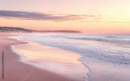 A peaceful beach at sunrise, with soft pink and orange hues in the sky and gentle waves washing ashore