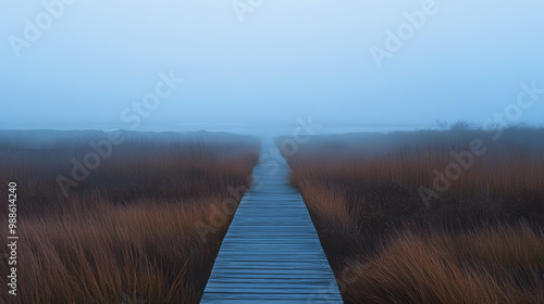 A peaceful boardwalk over a salt marsh leading to a distant fog-shrouded beach.