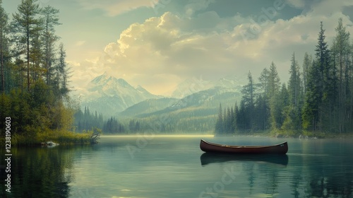 A peaceful canoe ride across a secluded lake with adventurous travelers paddling through calm waters.