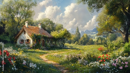 A peaceful countryside scene with a small cottage and a blooming garden in the foreground