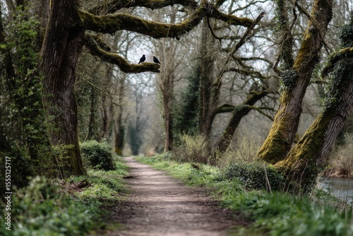 A peaceful forest path stretches through lush greenery with moss-covered trees, while two birds rest on a nearby branch amidst the tranquility