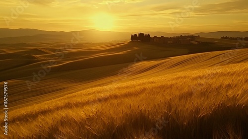 A Peaceful Harvest in Golden Light. A Sunset Over Wheat.