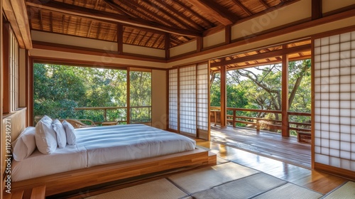 A peaceful Japanese-inspired bedroom with sliding shoji doors, a wooden platform bed, and warm, earthy tones creating a tranquil atmosphere