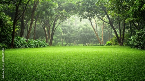 A peaceful morning scene with a lawn covered in dewy grass, surrounded by trees and a misty haze in the air.