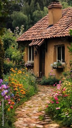 peaceful, rural, bungalow, mocha, mousse, wall, terracotta, roof, colourful, wildflower, cobbled, pathway, warm, atmosphere, professional, photo, inviting, cosy, radiant, polished, seamless, aesthetic, textured, organic, harmonious, vibrant, balanced, timeless, aglow, chic, serene, stylish, refined, sophisticated, elegant, picturesque, photorealistic, captivating, intricate, smooth, artistic, natural, charming, tranquil