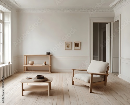 A peaceful Scandinavian living room with clean white walls, a light wooden armchair, and a small matching coffee table on a wooden floor