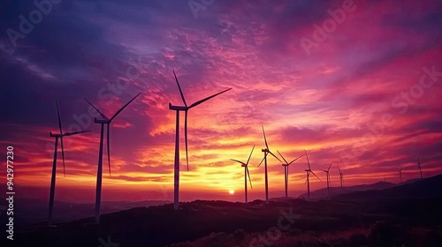 A peaceful scene of wind turbines at sunset, the sky glowing with vibrant colors, representing the harmony of nature and technology.