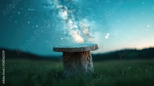 A peaceful wooden log rests in a field under a mesmerizing starry sky filled with galaxies, creating a tranquil scene that inspires reflection and connection with nature's beauty.