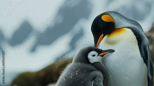 A penguin with her cub, mother love and care in wildlife scene