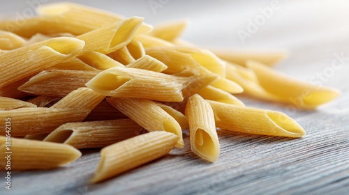 A penne pasta on pale wooden table, clean neutral tone