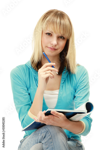 woman, white, pen, young, 1, idea, student, background, book, isolated, file, document, blond, attractive, sitting, business, write, adult, success, people, vertical, caucasian, female, cute, smile, up, girl, holding, folder, textbook, face, employee, thinks, businesswoman, beauty, hair, looking, education, beautiful, note, manager, office, pretty, hand, reading, pensive