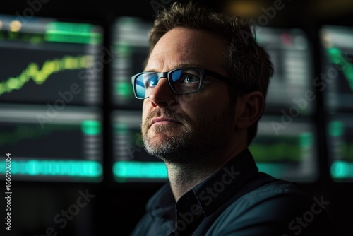 finance, stock exchange, investment, trading, business, businessman, chart, graph, investor, stockbroker, trader, technology, screen, monitor, strategy, planning, contemplation, thoughtful, serious, professional, office, workplace, success, growth, future, economy, risk, opportunity, analysis, prediction