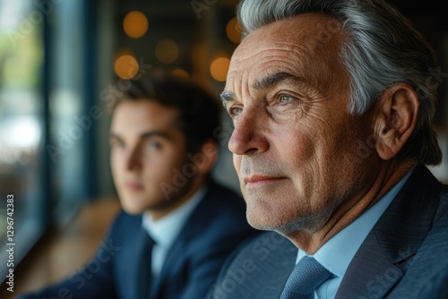 A pensive older businessman looks thoughtfully out a window, a younger colleague sits beside him.