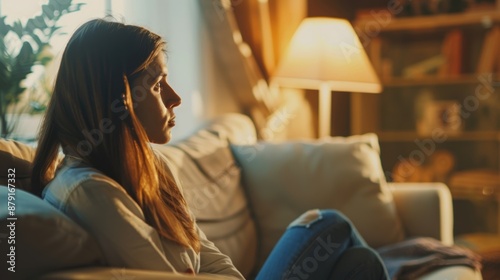pensive, woman, sitting, alone, couch, home, ambient, lighting, warm, reflective, deep, thought, solitude, contemplative, thoughtful, introspective, relaxed, living, room, peaceful, quiet, serene, indoor, thinking, moody, emotional, cosy, domestic, private, personal, moment, interior, casual attire, light, time