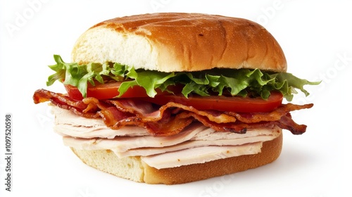 perfectly, assembled, turkey, bacon, club, sandwich, soft, bun, tender, slice, crispy, fresh, lettuce, tomatoes, each, vibrant, colours, subtile, captured, precision, set, isolated, white, background, highlight