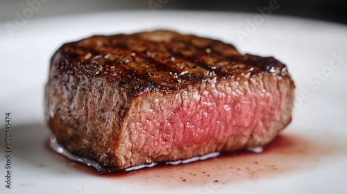 A perfectly cooked steak, its exterior browned and crispy, is placed on a white background.
