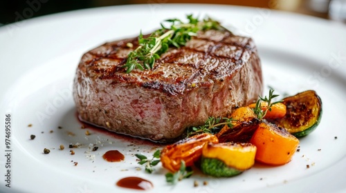 A perfectly cooked steak with a medium-rare center, garnished with fresh herbs and served with a side of roasted vegetables on a white plate.