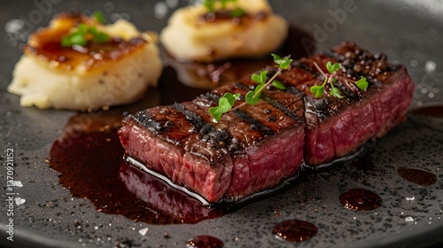 steak, seared, marbling, gold, light, truffle, mashed, potato, red, wine, epicure, dish, luxury, elegant, decadent, food, fine, dining, eatery, meal, rich, texture, closeup, grill, plate, savoury, indulgent, fresh, tender, premium, culinary, high-end, favor, delicious, plating, table, art, preparation, indulgence, high-quality, meat, chef, gastronomy, sauce, beef, tenderloin