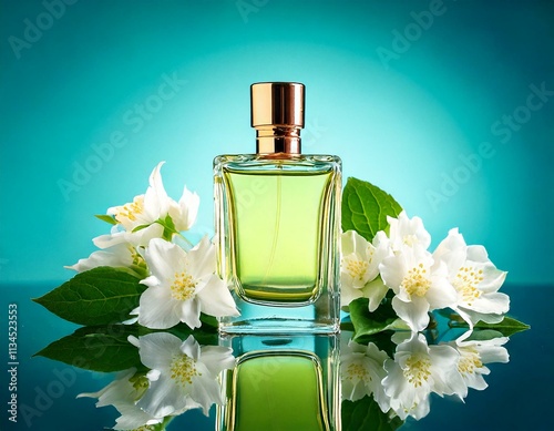 A perfume bottle surrounded by jasmine flowers on a light blue background