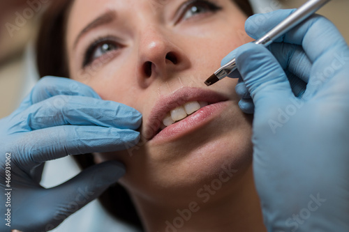 a permanent makeup artist applies markings on the girl's lips, contour on the lips for a lip tattoo procedure in the salon, lip tattoo