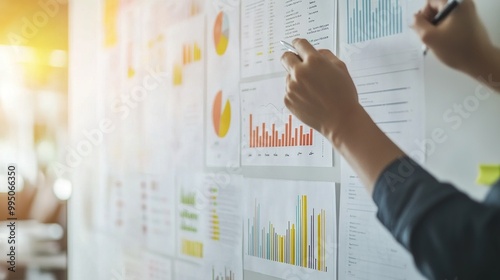 A person analyzes data on a wall covered with charts and graphs, using a marker to highlight information in a bright workspace.