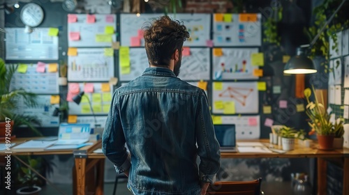 A person analyzes project documents on a wall covered in sticky notes and graphs in a creative workspace.