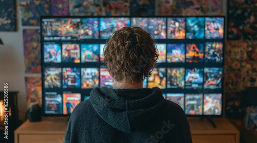 A person browsing a custom streaming platform interface on a smart TV.