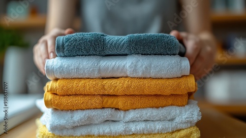 A person carefully folding towels in a neat stack, finding peace in the simple task in a quiet laundry room