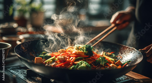 A person cooking a stir-fry with colorful vegetables and tofu in a wok on a stove, with steam rising and natural light from the window