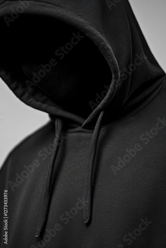 A person dressed in a black hoodie, suitable for urban or streetwear photography