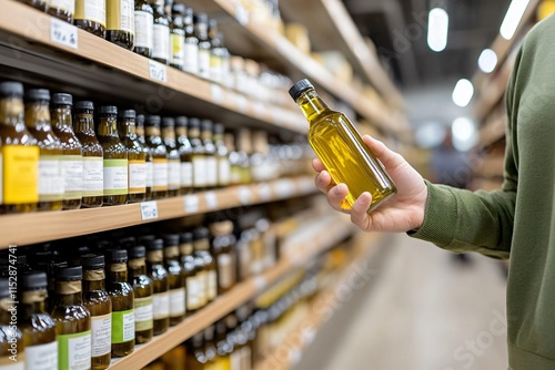 A person examines a bottle of oil while browsing a shelf filled with various bottles in a grocery store aisle.