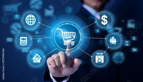 A person finger touches a holographic shopping cart icon surrounded by other online shopping icons such as a calendar, dollar sign, and shopping cart.
