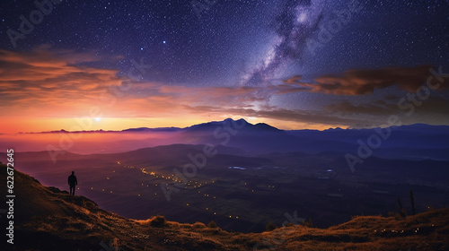 ai, generative, silhouette, starry sky, gaze, contemplation, wonder, awe, calmness, night, universe, celestial, beauty, captivating, serenity, cosmic, connection, enraptured, sunset, sky, nature, landscape, meditation, evening