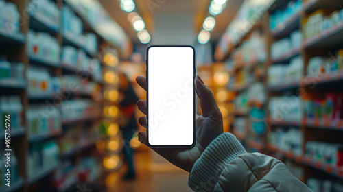 A person holding a modern smartphone with a blank white screen in a pharmacy aisle with shelves of products and medicine, highlighting the integration of technology in a retail drugstore