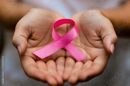 A person holding a pink ribbon, symbolizing awareness for breast cancer awareness.