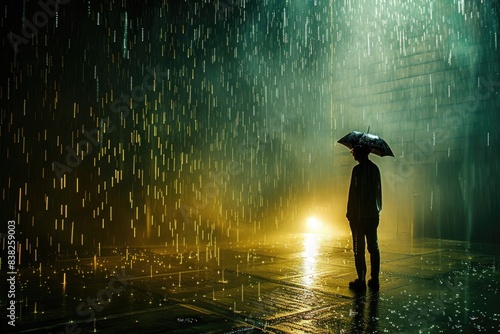 A person holding an umbrella and standing in rainy weather, perfect for illustrating wet weather conditions or outdoor activities