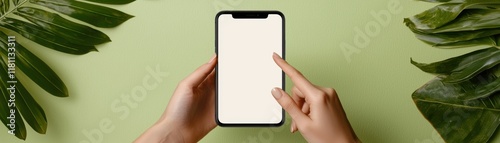 A person holds a smartphone against a green background surrounded by leaves, showcasing a blank screen ready for use.