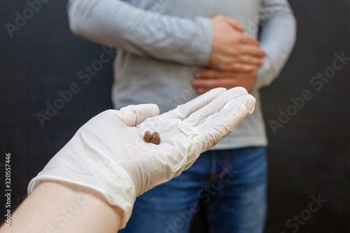 A person holds his stomach, gastritis, abdominal pain. Glove with pills close-up
