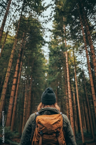 A person in a beanie and backpack navigates a dense forest path, exploring the serenity and beauty of nature.