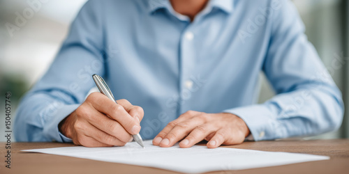 A person in a blue shirt is signing a document at a desk, focusing on the hand and pen.