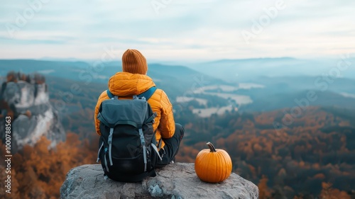 A person in a bright jacket sits on a cliff's edge, gazing at a scenic landscape, with an orange pumpkin beside them, surrounded by autumn colors.