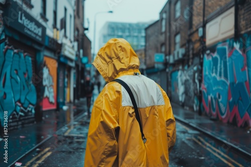 urban, raincoat, yellow, graffiti, alley, street art, city, rainy, moody, gritty, vibrant, contrast, exploration, solitude, adventure, photo, streetscape, weather, colourful, perspective, backview, hooded, pedestrian, wet, reflections, atmosphere, urban decay, shop, industrial, edgy, artistic, spraypaint, puddle, dreary, stormy, neon, texture, depth, composition, cinematic, lonely, wanderlust, melancholy