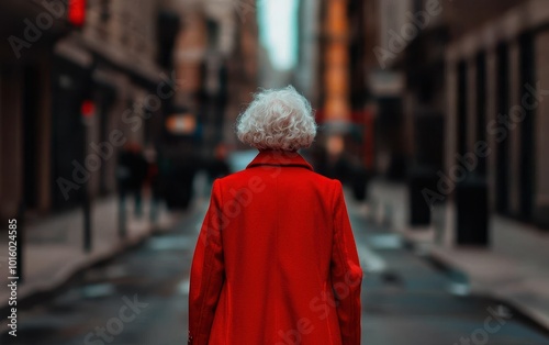 person, street, city, red, coat, walk, capture, thoughtful, moment, journey, senior, behaviour, backview, vibrant, lifestyle, travel, downtown, movement, surround, sidewalk, female, solitude, fashion, landscape, snapshot, contrast, modern, realism, culture, high-coloured, attire, candid, ambience, detail, story