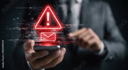 A person in a suit holds a smartphone displaying a digital alert symbol, emphasizing communication and urgency in a tech-savvy environment.