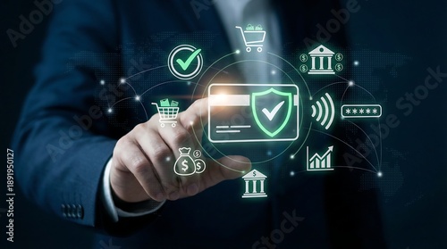 security, online, payment, digital, finance, technology, credit, card, shopping, e-business, protection, datum, encryption, cyberspace, network, fraud, risk, transaction, banking, mobile, access, icon, interface, screen, touch screen, businessman, suit, modern, future, connectivity, growth, analysis, statistic, billfold, money, dollar, building, lock, check, safe, system, cloud, wireless, global, innovation, automation