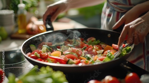 cooking, vegetable, pan, stove, kitchen, food, receipe, meal, person, human, chef, culinary, domestic, household, appliance, utensil, ingredient, healthy, nourishment, diet, mealtime, dining, family, home