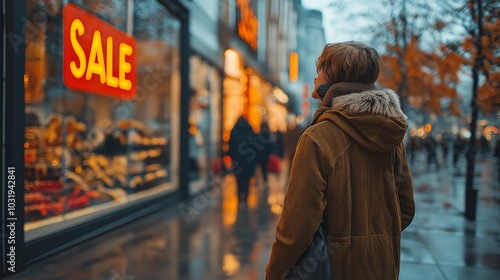 A person is standing in front of a store on which a sale is written. Discount season and sale, shopping