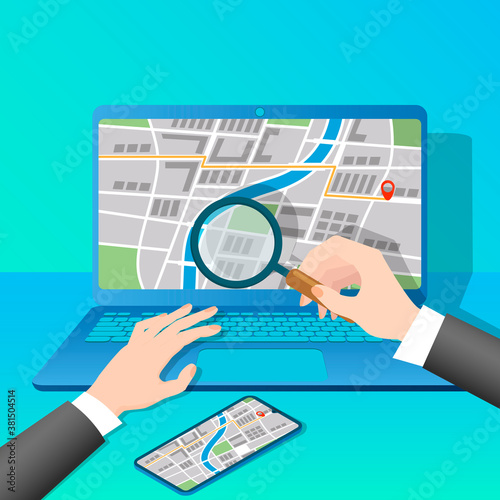 person, navigation, map, mark, laptop, way, road, avenue, smartphone, magnifying glass, magnifying glass, datum, cyberspace, communication, computer, illustration, technology, character, design, symbol, vector, global, graphic, human, global positioning system, online, opportunity, prevention, safety, screen, social, study, workplace, businessman, mobile, office, work, business, home, concept, equipment, flat, objective, service, strategy, teamwork, professional, connection, distant, computer monitor